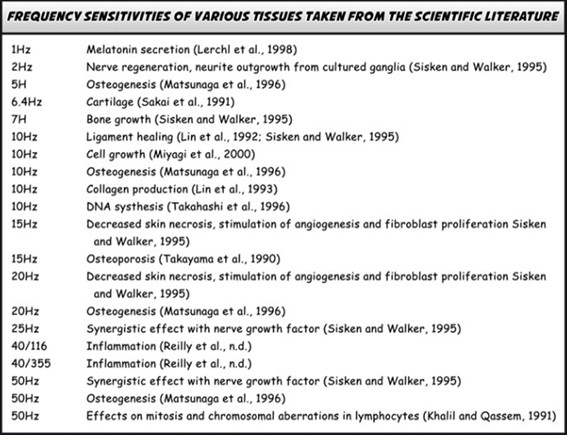 At the level of tissues, the same 0-30 Hz frequency range has been shown to have the most positive benefits on the human body. The Table (below) lists frequencies in the 0-30 Hz that biomedical researchers are finding that are effective for jump starting healing in a variety of soft and hard tissues. In 1995, Siskin & Walker noted that an ELF of 2Hz stimulated nerve regeneration, and a frequency of 7Hz can be used to stimulate bone growth. Frequencies of 10Hz promote ligament healing, and 15, 20, and 72Hz may be used to decrease skin necrosis and stimulate capillary formation. Since tissues and organs are made of cells this research further confirms the hypothesis that the human body needs, resonates and responds to the 0-30 Hz range of frequencies.